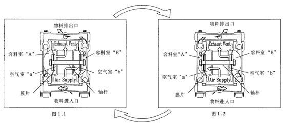 軸桿上固定有兩個膜片,每端一個。當(dāng)壓縮空氣供至空氣室b(右側(cè),見圖1.1)時,軸桿向右移動,容料室B中的物料被擠出,同時被吸進容料室A中。